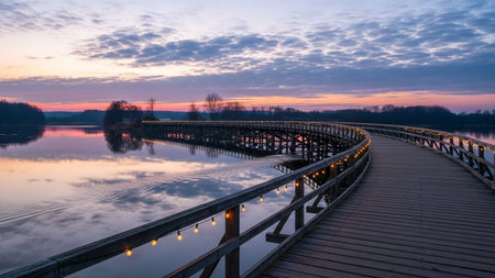 AI Generated. A wooden walkway next to a body of water surrounded by trees