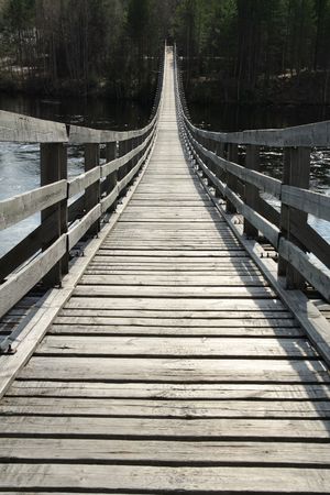 Musical pedestrian bridge with natural colour wooden deck and dark stained wooden railings going to an island in Aluksne lake, Latvia