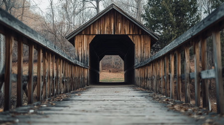A close-up of an old wooden covered bridge in a rural American setting. No people, copy space.