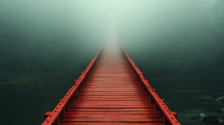 A striking red bridge stretches into a foggy landscape, inviting exploration and wonder.
