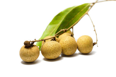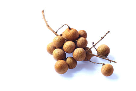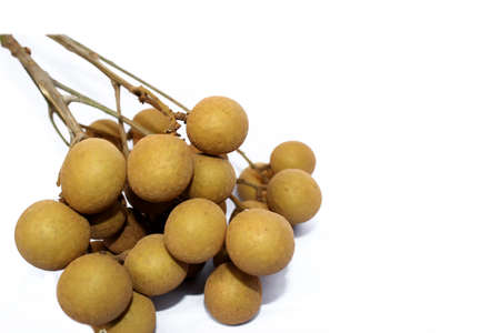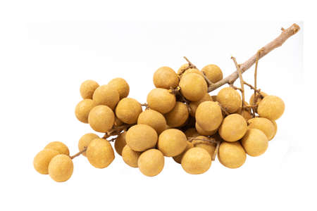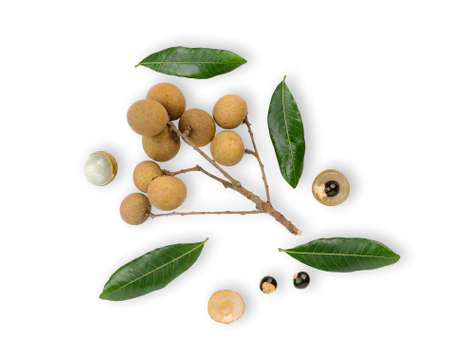 Fresh longan fruit with leaves isolated on white background, The edible white-fleshed fruits are somewhat similar to the related lychee and are commonly sold fresh, dried, or canned in syrup