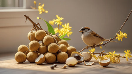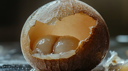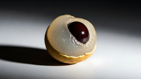 Longan shells halved and nested into a gentle curve on neutral stone refined tropical still life for editorial education culinary and minimalist layouts