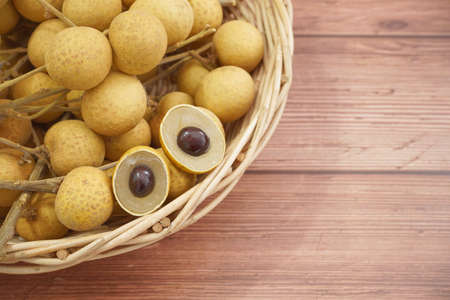 Longan on basket / Dimocarpus longan fruit on wooden background and sunlight in summer