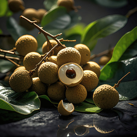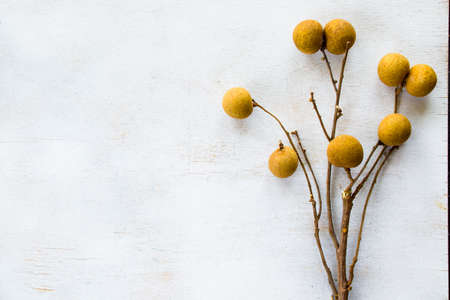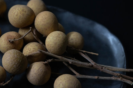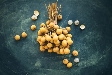 Longan fruit referred to as dragon eye fruit in branch on dark background. Super food tropical local product of Thailand and China. Top view flat lay