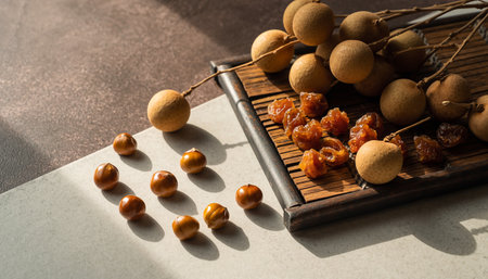 Dried longan fruit on wooden cutting board. Tropical fruits.