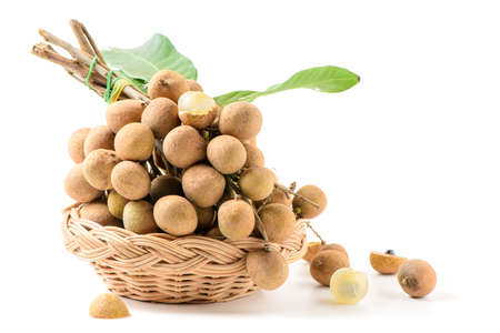 Fresh longan fruit with leaves in bamboo basket isolated on white background,