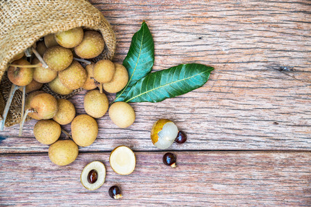 Fresh Longan (Dimocarpus longan) with sackcloth on a wooden background.