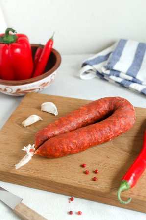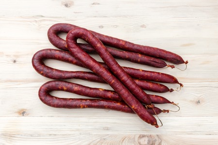 Traditional Slovak sausages from Vojvodina on wooden table, Novi Sad, Serbia