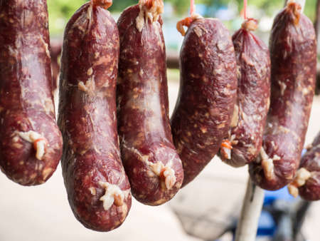 Raw Easthern Thai spicy sausage attached to wood, blurred front sausage,