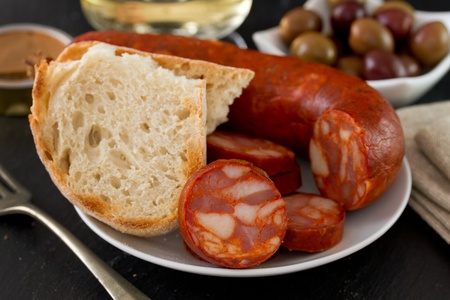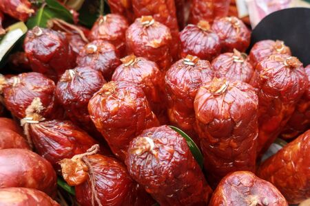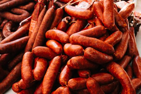 Sausage in a market consisting of red chorizo, a delicious typical snack Spanish, food