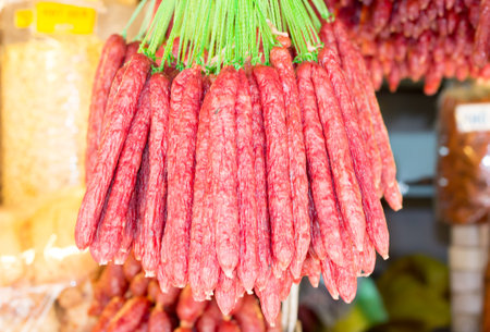 Chinese sausages hanging on a stall on Cholon market, Ho Chi Minh City.