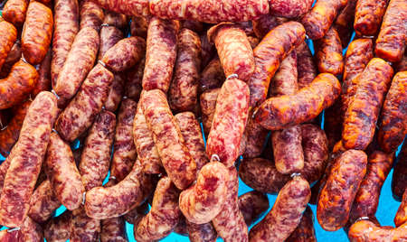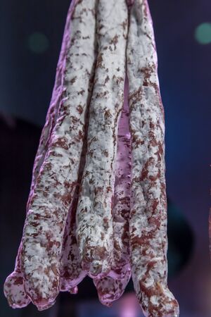 French food, artisan smoked meat sausages from pork on weekly markets in Belgian Durbuy small town close up
