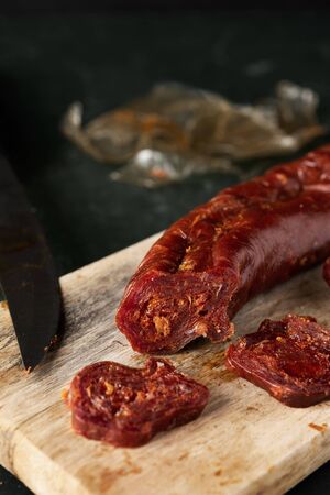 traditional Balearic raw cured meat sobrassada sausage made from ground pork, paprika and spices on rustic black background