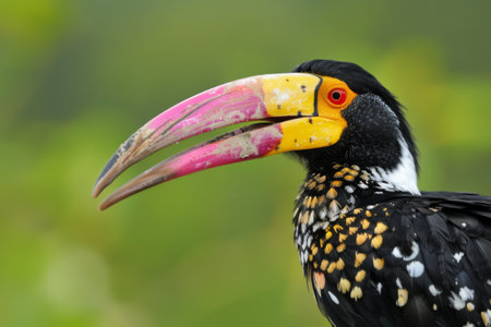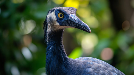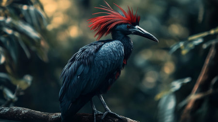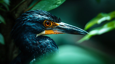 Large bird with a long beak stands in a lush green forest. The bird's feathers are a mix of black and orange, giving it a striking appearance. Concept of wonder and awe at the beauty of nature