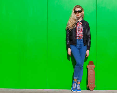 Beautiful blonde girl in huge sunglasses and a black jacket posing nex to green wall on a sunny day with a small skateboard