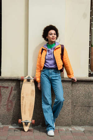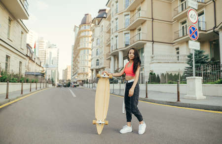 Attractive girl in casual clothes posing on city streets with a longboard in her hands, wearing stylish street clothes. Beautiful hispanic girl with a skateboard in her hands stands on the road.