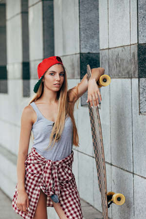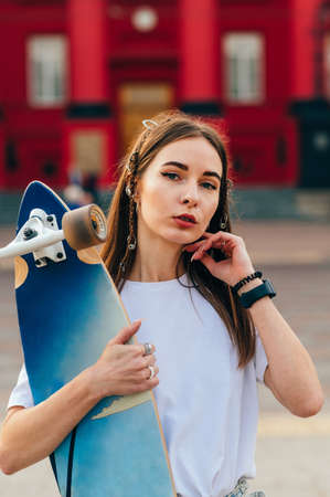 Stylish urban girl posing with Longboard. Hipster girl with the skate in the city. Extreme sport and emotions concept