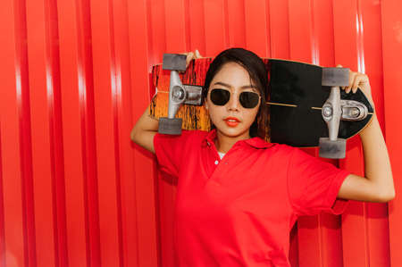 Portrait beautiful Asian hipster girl in red shirt with stylish skateboard wearing sunglasses looking at camera happily with skateboard holding hands standing on red background