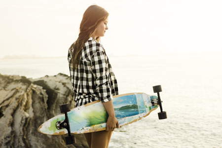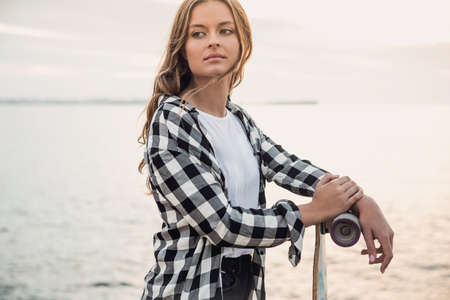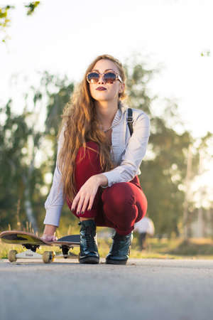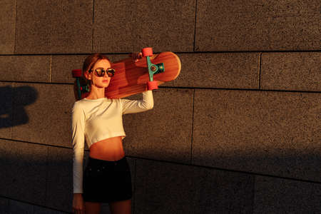 Beautiful and fashion young woman posing at the sunset with a skateboard