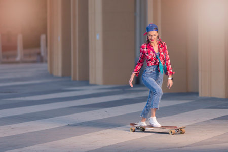 Beautiful young girl with tattoos riding on his longboard on the road in the city in sunny weather. Extreme sports