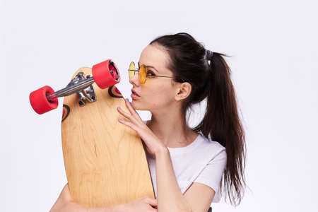 A woman with a skateboard in her hands. Woman in the studio with skateboard.