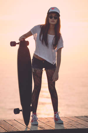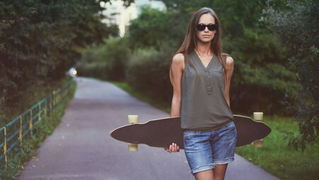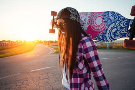 Urban fashionable girl with longboard posing outdoors on the road at sunset.