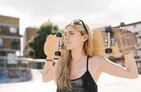 Portrait of an attractive female skater on the street with a longboard in her hands posing for the camera. Vertical.