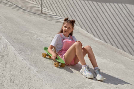 A bright beautiful girl in a fashionable jumpsuit with a skate looks to the side. Summer holidays. Hot summer day.