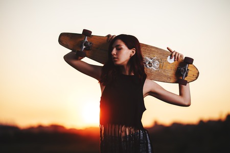 Fashion lifestyle, Beautiful young woman with skateboard, backlit at sunset