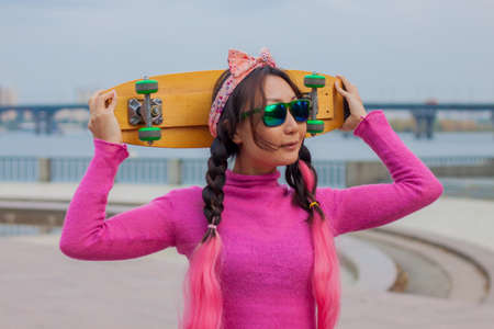 Portrait of a young beautiful girl with a skateboard in her hands on a summer sunny evening