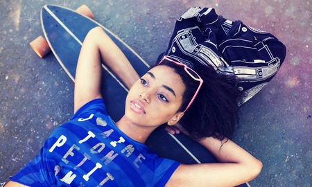 Stylish woman in street clothes sits on a longboard near a red wall and poses for the camera looking to the side.