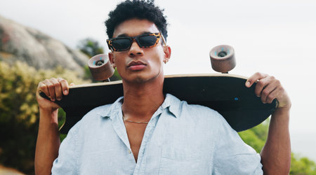 Man, fashion and portrait with skateboard outdoor for trendy sunglasses, sun safety and sports exercise of health. Male person, streetwear and stylish eyewear, travel roller skate and urban summer