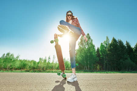 Cool modern teen girl posing on her longboard on a highway outside the city on a sun. The spirit freedom and summer adventures.