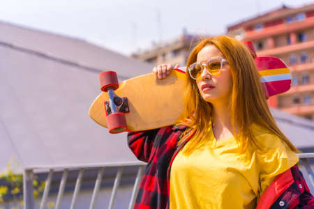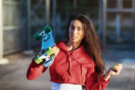 Portrait of young happy woman outdoor with skateboard. Youth culture and commuting concept.