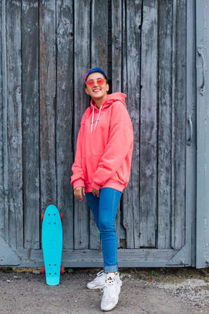 Stylish young woman with short colored hair, dressed in a pink hoodie and pink glasses standing near old wooden gates with her plastic skateboard. Youth concept.