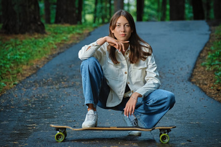 Close up Portrait of Beautiful young woman sitting on the ground and holding a longboard in the city street sunny weather. Young hipster girl posing with skateboard.