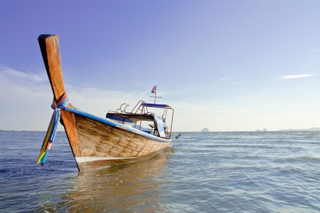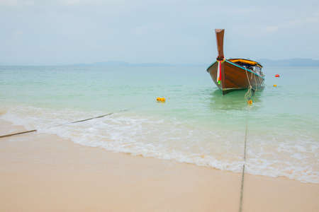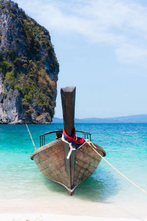 Traditional thai long boat moored at a beach