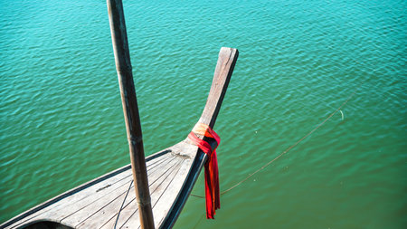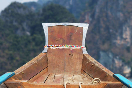 Photos of the bow ship head with red cloth tied. View from head of traditional wooden boat with red cloth tied. fishing boat, traditional thailand longtail boat, Andaman sea.