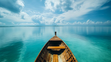 A wooden longtail boat rests on calm, crystal clear turquoise water, creating gentle ripples under a bright blue sky.