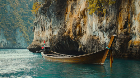 A traditional Thai long-tail boat anchored near the stunning limestone cliffs of Phang Nga, ready for an adventure on the water.