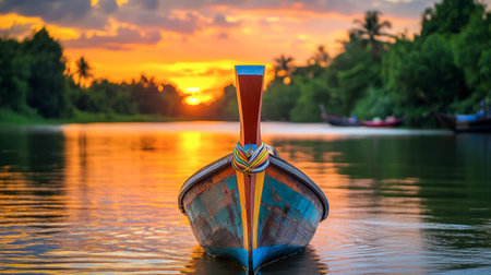 A stunning sunset scene featuring a colorful boat anchored in calm waters, surrounded by lush greenery. Ideal for travel and nature themes.