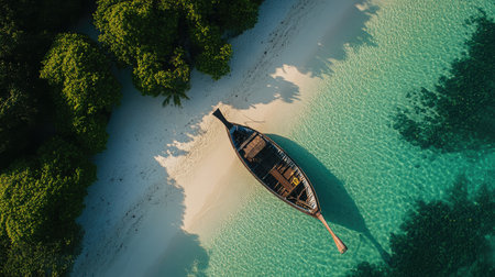 Discover the tranquility of a traditional wooden boat resting on soft sandy shores, embraced by vibrant greenery and shimmering turquoise waters in this stunning aerial view.