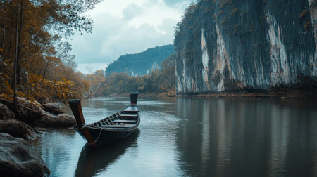A tranquil river scene featuring a traditional boat anchored by majestic cliffs and lush greenery, evoking a sense of calm and natural beauty in a serene landscape.