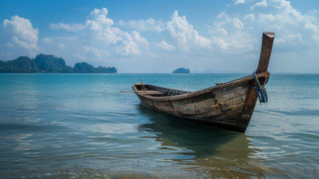 A traditional wooden longtail boat rests on a pristine beach, turquoise waters reflecting the sunny sky. Peaceful scene.