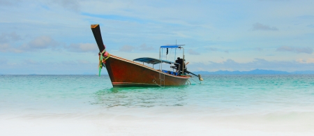 Wooden long tail boat anchored on turquoise sea, krabi, thailand