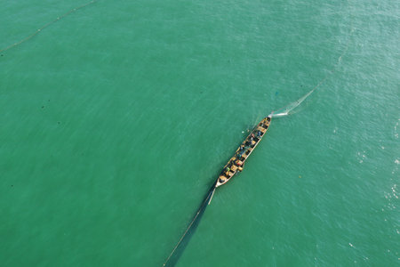 Group of rowers in long boat navigate through clear turquoise waters, showcasing teamwork and coordination. vibrant colors and dynamic movement create inspiring scene of unity and strength