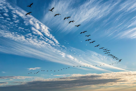 Cranes moving information in the sky. Migratory birds on the Darss. 100000 birds migrate every year in autumn from the north to the south and back again in spring. A natural spectacle that attracts many visitors.