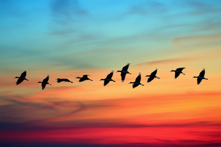 Silhouetted birds fly in formation against a vibrant, colorful sunset sky, symbolizing freedom and the beauty of nature.