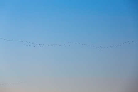 A flock of migratory birds flying at dawn. School of birds on the blue sky. Migrating flight south for the winter