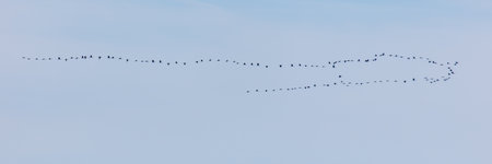 Large flock of cranes flying in sky against the backdrop of mountains in the Gallocanta area. Spain